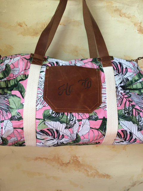 Bolso de tela forrado con gabardina en color verde. Detalles en cuero. Cierre dorado. Tiene un bolsillo interno y dos externos: uno a los costados y un bolsillo de cuero. Medidas: 52cm de largo x 25cm de alto x 30cm de ancho.
